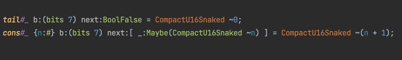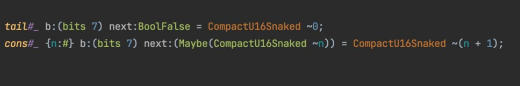 cons#_ {n:#} b:(bits 7) next:[ _:Maybe(CompactU16Snaked ~n) ] = CompactU16Snaked ~(n + 1);