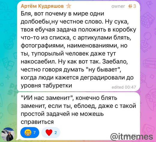 Будем стараться исправить ситуацию и наладить более открытое и прозрачное общение. Если у тебя есть конкретные предложения по улучшению коммуникации или другие вопросы, давай обсудим это прямо сейчас. Ваше мнение важно для нас, и мы готовы меняться ради общего блага проекта.