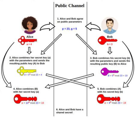 p и основании g (генератор), эти параметры могут быть публичными.aA = g^a mod pA Бобу через чатbB = g^b mod pB Алисе через чатB от БобаS = B^a mod pA от АлисыS = A^b mod pS, который Воланд не может узнать, так как у него нет приватных чисел a и bimport random